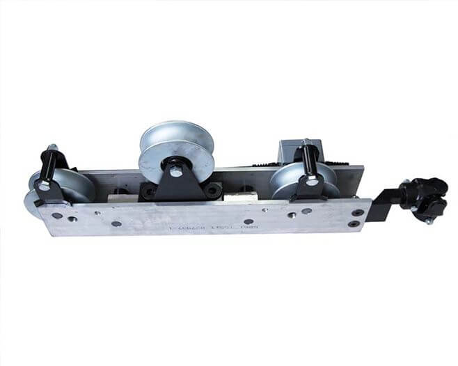 This Running Line Tensiometer is ideal for applications involving a moving wire rope of diameter 0.5 to 1.5in and a rope tension up to 100,000 lbs. The scale rides on the rope and determines cable tension by measuring the force of small deflections from its rollers. Common applications include crane boom, cable ferry, and line tension measurement.