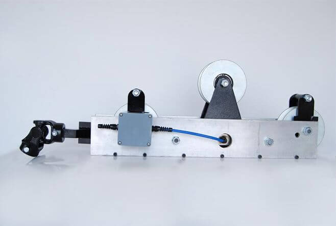 The Running Line Tensiometer arm is anchored at one end to a fixed, solid point (e.g., a boom). The anchor point locks the Running Line Tensiometer so it will not move with the wire rope and cause safety problems. Between the anchor point and the Running Line Tensiometer body is an arm equipped with two “U” joints. The “U” joints allow the Running Line Tensiometer to move freely in all directions and therefore does not affect wire rope spooling. This structure creates the ultimate in wire rope mobility and operator safety.